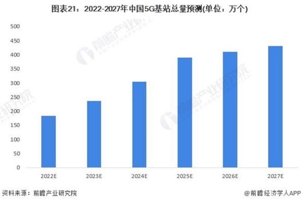 根据工信部数据,截至 2022 年底,我国新建 5G 基站 88.7 万个,目前 5G 基站总量已达到 231.2 万个,占全球比例超过 60%。前瞻产业研究院根据我国 5G 基站建设现状及未来发展趋势初步预测,至 2025 年末,我国 5G 基站总数或将达到 390 万个 ; 至 2027 年末。我国 5G 基站总数或将突破 430 万个。
