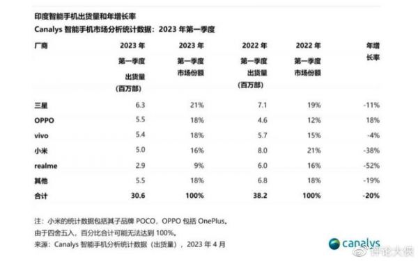 印度智能手机市场出货量第一季度下滑20%,OPPO逆势增长,小米跌出前三