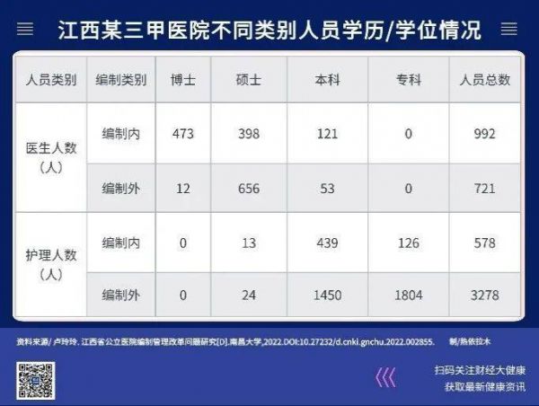 编外人员已经在需要快速扩张发展的“大三甲”成为主力军。上述江西省三甲医院,2021年在岗职工6790人,其中编外用工人员占总人数的71%,包括人事代理854人,编外聘用3651人,编外合同290人,外籍专家2人。