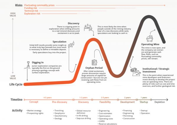 拉松德曲线的含义是,对于一个初级矿业公司来说,从开始勘探,到最后达产,会有两次股价上涨: