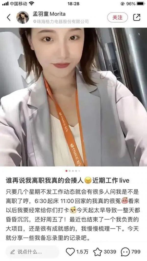 而孟羽童最近在小红书上的账号,除了分享女生职场成长感悟之外,更多在推广她拍的创意广告,涉及多个汽车、服装等产品,但与格力电器没直接关联。而在抖音上,小编发现,孟羽童在4月22日更新了一条自己吃生日蛋糕的视频。至今已没有再更新。