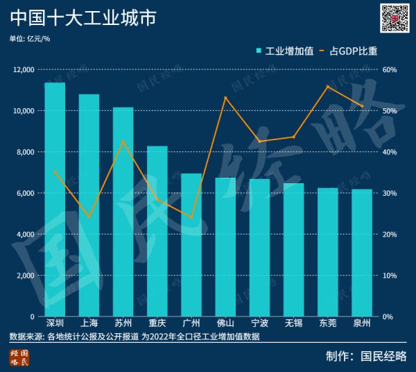 不同的是,泉州是名副其实的工业城市,与佛山东莞一样,工业在经济中占据半壁江山,比深圳上海还要更“工业”。