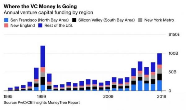 Google、Facebook、Apple……这里有一流的企业,聚集了一流的人才,也有一流的平台和资源。同时,这里还有着高密度的资本支持:根据普华永道和CB Insights联合发布的数据,2018年湾区(包括旧金山地区和硅谷地区)总共获得了全美46%的风险投资,从这一片狭小的地带引领着全美的创投风潮。