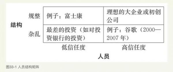 “高信任度的优秀人员和杂乱的结构,这种组合基本上是无政府状态。最接近这种状态的是2000—2007年的谷歌,公司中有才能的人可以在各种不同的项目中工作,可以不受太多约束地工作。”