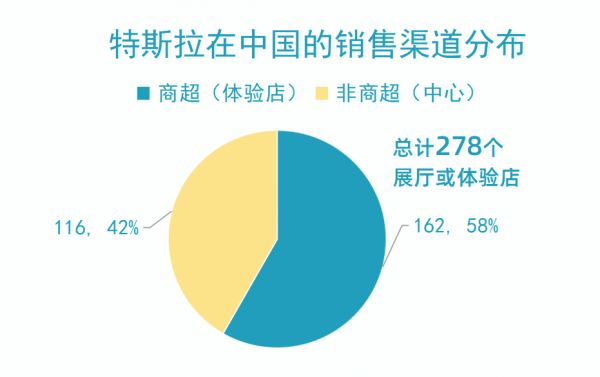 截至2023年5月4日,特斯拉中国官网上公布的销售渠道(体验店和展厅)中,除港澳台,一共有278个网点,其中有162个体验店,116个特斯拉中心。