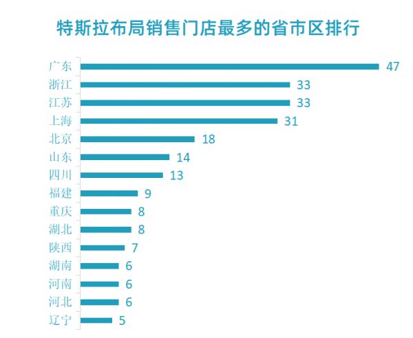 特斯拉的门店地域分布,也基本和销量正成比。卖得最好的省区,也是门店数量最多的。长三角、珠三角和北京是特斯拉热销区域,也分布了特斯拉最多门店。