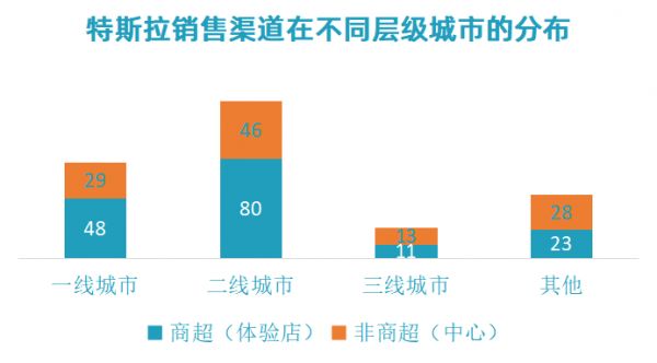 特斯拉总体销售门店中,体验店也就是商超店占比近六成。而且还要注意的是,在一二线城市,特斯拉的商超店占比又更高一些。