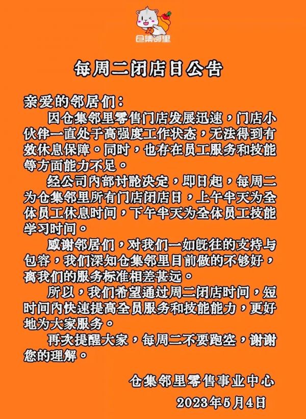 为提升门店服务水平,平台更计划每周二闭店,做员工培训,规划门店活动。