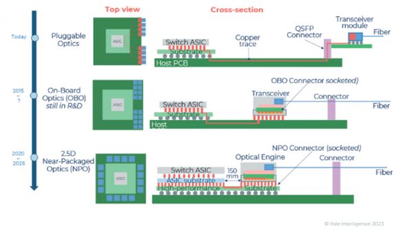 CPO是一种创新方法,可以将光学器件和交换机ASIC紧密结合在一起。由于在50T交换芯片中使用16个3.2Tbps光学模块是当今技术的挑战,NPO通过使用高性能PCB基板(一种内插器)解决了这一问题。NPO内插器更宽,使芯片和光学模块之间的信号路由更容易,同时仍能满足信号完整性要求。相比之下,CPO能以更低的信道损耗和更低功耗使模块和主机ASIC更接近。