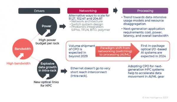 2023年,GPT引发了驱动力和应用范式的转变。高带宽、每机架高功率预算、HPC新型光链路捉襟见肘。随着从联网(交换)到处理(AI/ML(机器学习))的范式转变,预计2024年将推出首个基于光学I/O的封装内Al系统,而CPO的批量交付预计将在2029年之后。