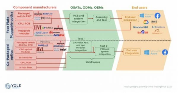 Yole Intelligence光子学和传感部门高级分析师Martin Vallo博士则表示:“在所需的电密度和光密度、热管理和能源效率方面,可插拔尺寸将限制其支持6.4T和12.8T容量的能力,使用硅光子学技术平台的共封装能够克服上述挑战。”