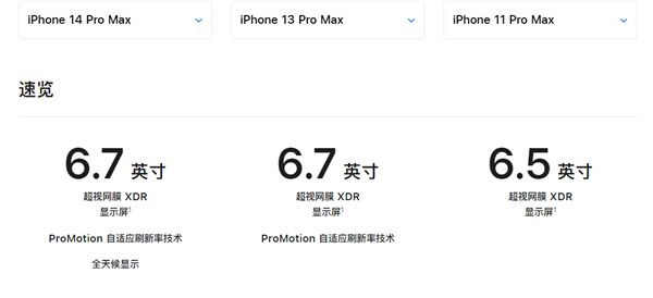 作为参考,iPhone整个Pro系列只有iPhone 11 Pro Max的屏幕尺寸为6.5英寸,后续Max机型均为6.7英寸。