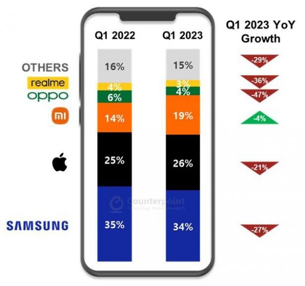 三星依然保持领先地位,这主要归功于旗舰 Galaxy S23 系列在欧洲市场的成功。三星目前在欧洲市场的份额为 34%,相比较 2022 年第 1 季度下降了 1 个百分点,出货量同比下降了 27%。