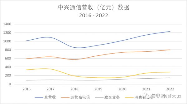 主要还是赶上5G风口,全程参与全球5G网络部署,运营商电信业务表现强劲。数据维度来看,中兴2022年在该领域营收达到800.4亿元创新高,即便在2016年至2018年的艰难时期,来自运营商方面的营收达到588.8亿、637.8亿与570.7亿元,占比总营收分别为58.16%、58.61%与66.74%。