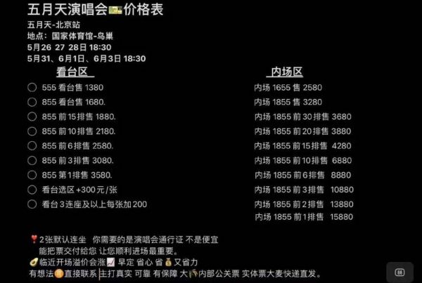 也有黄牛不示弱,表示要“让wmls(五月天歌迷)的热搜付出代价。”有人直接抛出价格单,原价555元的票售价1380元,原价855元的看台票售1680元,原价1655元的售价2580元,翻倍增加。他们还对每一票档进一步细分,比如855元的票档,前6排售价2580元,前3排售价3080元,第一排是3580元。