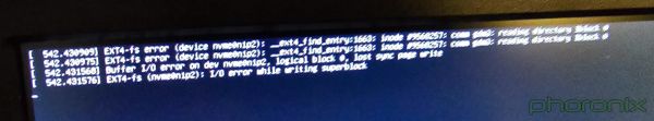 外媒原本以为这款硬盘就算不装散热器也可以运行,但实际上它开机后只在很短的时间内就出现 EXT4 报错并进入只读模式。