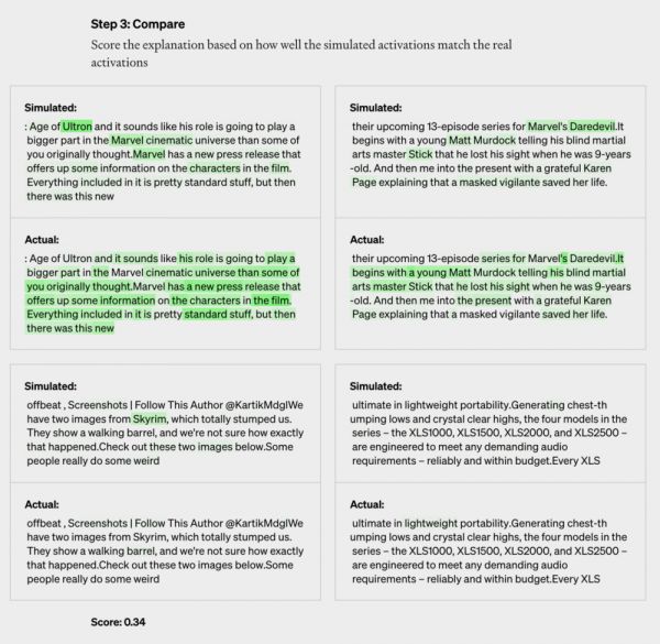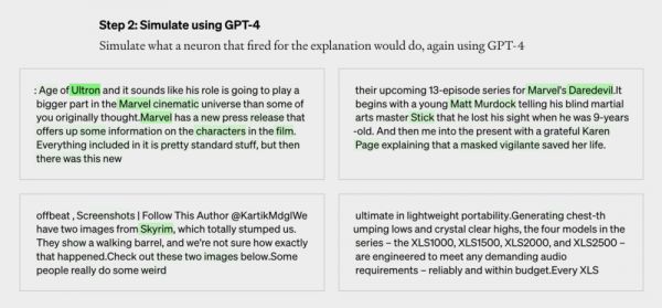 第一步,让 GPT-4 针对这段文本,生成解释。比如在下面的案例中,神经元主要针对漫威内容。GPT-4 接收到文本和激活情况后,判断这与电影、角色和娱乐有关。