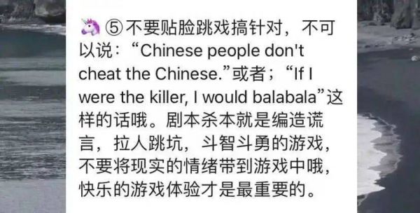 DM先在群里讲了一些基本规则,和往常的剧杀一样,英文剧本杀也强调不能贴脸,更不能在破防之际说“Chinese people don't cheat the Chinese(中国人不骗中国人)”之类的发誓言论。