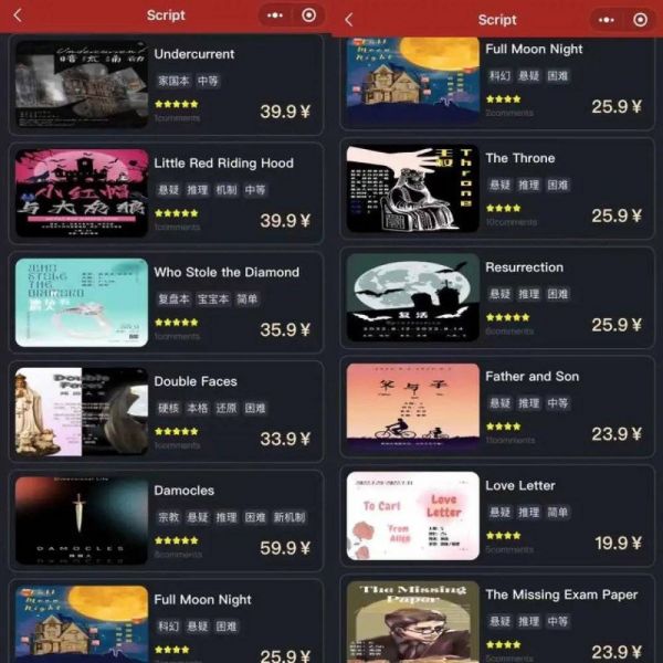 小姜告诉我,2017年的剧本杀和现在完全不一样,由于是国外“谋杀之谜”传进来的游戏,当时几乎全是推理为主的硬核破案剧本,整个行业也很少有人拥有正版剧本,大家玩儿的都是自己打印的,角色名也大多是拗口的英文直译名。那时唯一比较困难的点在于人人都想参与游戏,没人想做只负责cue流程和发线索的“工具人”DM。