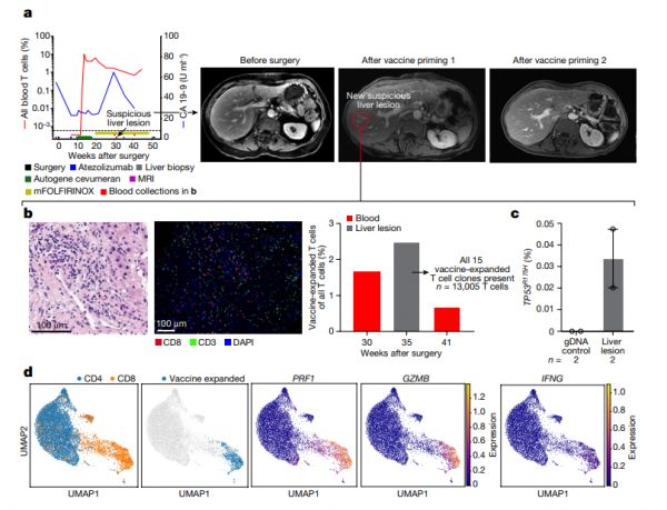 根据作者的观察,疫苗激发的T细胞甚至会在肝脏发生集结,这些集结区域往往可以检测到TP53突变,意味着癌细胞可能已经转移到了此处,而疫苗T细胞正在设法阻止肝转移的发生。