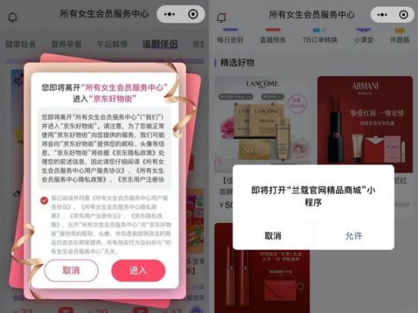 第一步,去淘宝化,打造私域流量池。“所有女生会员服务中心”是美one在2021年3月推出的一个微信小程序,有直播预告、淘宝订单转换、许愿瓶、积分兑换等功能,主要是起一个辅助作用,去年年初,在这个小程序上还出现过兰蔻、阿玛尼等商品链接。