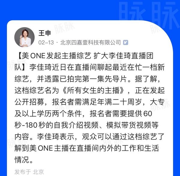 今年年初,更是推出了主播选拔真人秀栏目《所有女生的主播》。在脉脉上,由用户透露,这款综艺的报名者需要提供60秒-180秒的自我介绍视频、模拟带货视频等内容。可以看出,该节目意在脱离李佳琦,从素人当中挖掘更多有潜力的主播。简单来说,就是打着“李佳琦亲选”的旗号,寻找着“下一个朱旺旺”。
