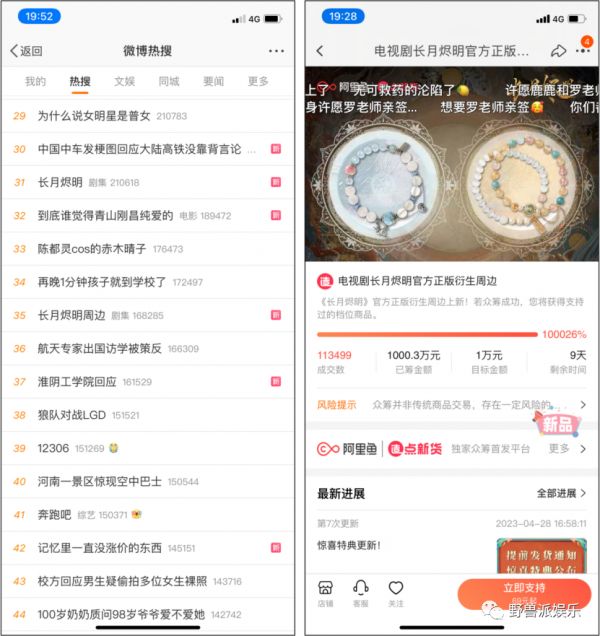 伴随着剧集的热播,《长月烬明》的衍生周边商品也迅速走红、破圈。“长月烬明周边”、“长月烬明带火敦煌风汉服”等IP周边话题持续保持各大社交平台热搜。而在由阿里鱼旗下娱乐电商平台造点新货打造的“长月烬明正版授权周边会场”上,手办、配饰、设定集、雨伞、华服等众筹和现货商品也获得了众多用户的青睐和热捧。其中特别值得一提的是,“长月烬明人物主题手串饰品”单项目众筹金额更是以超过1000万元的战绩,一举刷新了国内剧集类IP衍生品单项目众筹的纪录,并且销量仍在不断增加。