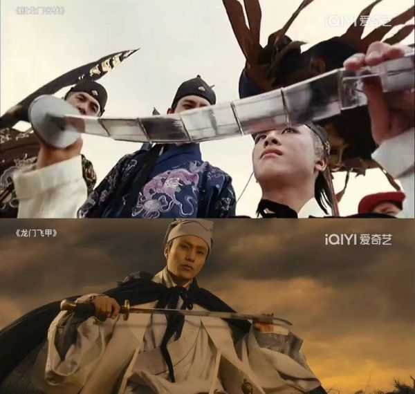 两部电影有一些相似的动作设计——掰断刀剑,弹作暗器。90年代甄子丹饰演的曹少钦虽然顶着大腮红,但举手投足间仍不失须眉之气。林青霞凌空跃起从上方攻来,甄子丹不慌不忙折断一柄刀,飞做雪花状向对方还击,尚算实写。