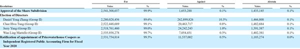 除了拆股方案外,阿里巴巴集团也重选了4名董事,包括香港前特首董建华、雅虎创办人杨致远、雀巢集团前执行副总裁龚万仁、阿里巴巴行政总裁张勇,而张勇是这次唯一一位由阿里巴巴合伙人团队提名的董事。
