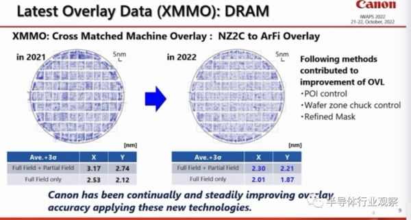 针对DRAM方面,佳能一直在不断改进套刻精度。使用POI 控制技术、晶圆区卡盘控制、精细掩膜等方式有助于改善套刻精度。