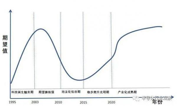 期望膨胀期:2003年,纳米压印技术首次纳入国际半导体蓝图(ITRS),技术的研究和期望进入高潮,这一时期,纳米压印相关设备被科研机构大量采购。