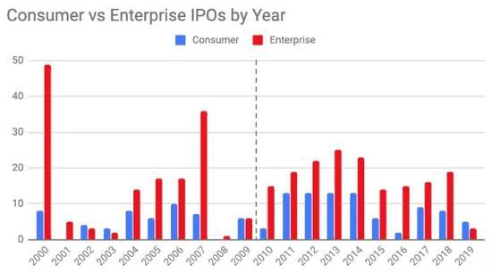 把这个表拆分为两个十年来看,2000到2009年,每年大约有15家2B类和5家2C类公司上市,比例是3:1。2010到2019年,每年上市的2B类和2C类大约是17家和8.5家,比例为2:1。