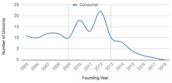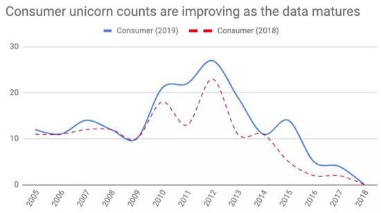 举个例子,2018年7月的2C独角兽大概有22个是在2012年创立的,2019年7月的同一数据是27个左右。