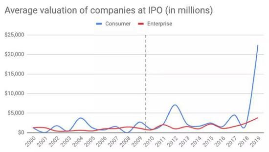 而回到刚刚那个估值图,如下图,2018年开始,2C企业在IPO时的估值却一飞冲天。