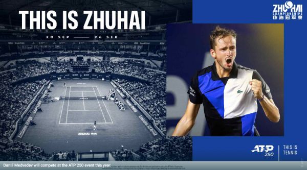 ▲ATP官方网站上,梅德维德夫与横琴网球中心的照片被拼接在一起做成海报,并冠以“珠海冠军赛迎接世界级网球赛事重返中国”的标题。