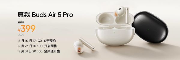 真我Buds Air5 Pro的售价为499元,首销价399元,5月10日17:30开启0元预约。