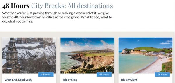 在该旅游杂志网站上,有一个48 Hours City Breaks(48小时城市游)的专栏,以时间为维度,重新整理全球城市的48小时旅程。