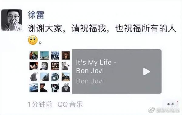 此后,徐雷也在朋友圈回应表示感谢,同时配了一首美国摇滚乐队Bon Jovi的《It's My Life》,出走半生,徐雷归来仍是少年。