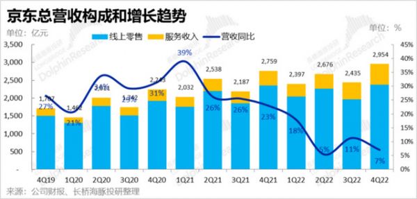 从2021年中开始,京东的营收增速再度开始走下坡,其中,京东自营零售的增速从2021年四季度的22.1%下滑至2022年四季度的1.2%,去年Q4京东自营零售收入为2376亿元,比市场预期低了近50亿。
