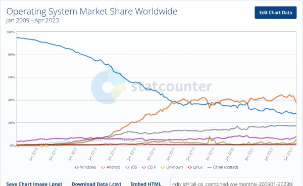 而在另一边,过去 Windows 一度占据超过 90%市场份额的时候,很大一部分人选择 Windows PC 只是想要一台电脑,实际使用中也往往采用默认的设置和网页浏览器。今天 Windows 依然是最重要桌面操作系统,但对越来越多人来说,使用 PC 的次数越来越少,智能手机(aka 掌上电脑)已经成为了最重要的设备,甚至就是「电脑」——可以用来阅读、听歌、看视频、购物等等。