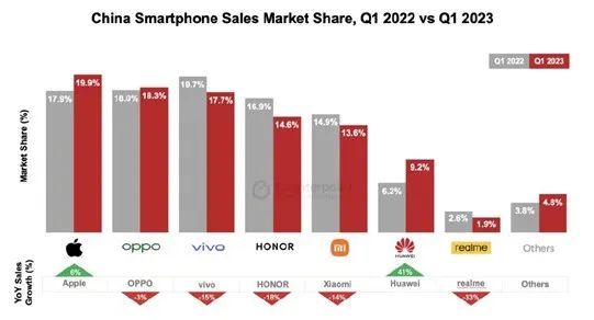 上述Counterpoint公布的数据也说明了这一点:今年第一季度,华为成为苹果之后唯一份额上升的国产手机品牌,并且增长幅度高达41%,而去年四季度华为增速同样高达15%,呈现出越来越快的增长加速度,这在整个手机市场持续触底的下行周期表现非常亮眼。
