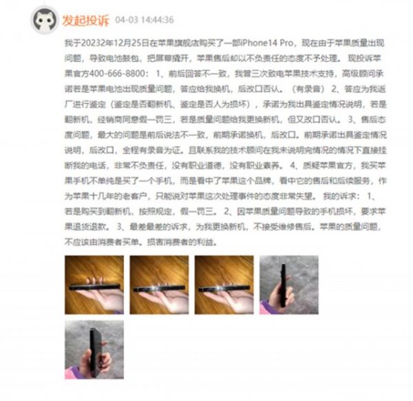 一位去年12月购买的iPhone 14 Pro用户表示,由于苹果质量出现问题,导致电池鼓包,把屏幕撬开,苹果售后却以不负责任的态度不予处理。