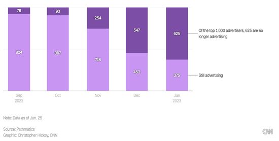 众所周知,自从马斯克接手Twitter以来,Twitter的广告业务持续流失。Twitter的广告商流失究竟有多严重呢?根据市场调研机构Pathmatics 的统计,截至今年1月,收购前在 Twitter 投放的前 1000 大广告商中约有 625 家都已经停止了投放,其中包括可口可乐、联合利华、Jeep、富国银行等大金主。
