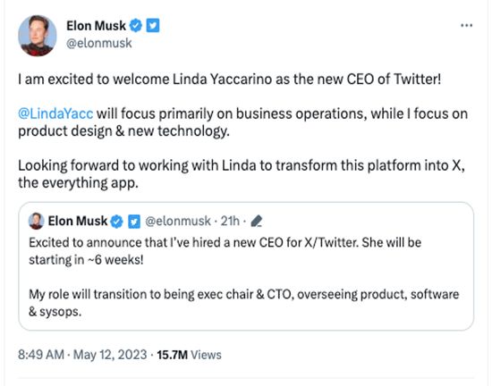 实际上,即使Linda Yaccarino担任CEO之后,Twitter的实际运营权也还是会掌握在马斯克手中。