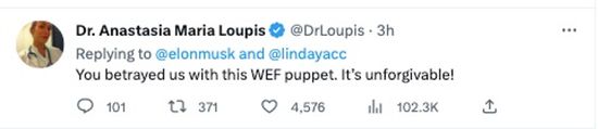 其中抨击者们最主要的一个吐槽点集中在Linda Yaccarino曾经在世界经济论坛(WEF)中所担任的重要职务上。
