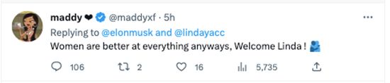 当然,与此同时,也有一些人对Linda Yaccarino到来充满期待。首先,作为科技领域少有的女性领导者,很多人希望看到她给Twitter带来的不一样的能量,并尽快帮助Twitter走出泥潭。