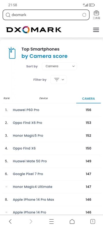 华为 P60 Pro DXOMARK 影像测试结果出炉:总分156,位列排行榜第 1 名