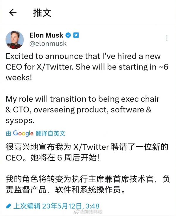 #马斯克将转任推特执行董事长和CTO#【马斯克将转任X和推特执行董事长和首席技术官】#马斯克宣布推特将迎来新CEO# 马斯克表示,他为X和推特找到了一位新CEO,她将在6周后开始履新。马斯克将转任X和推特的执行董事长和首席技术官,负责产品、软件和系统操作。(财联社)