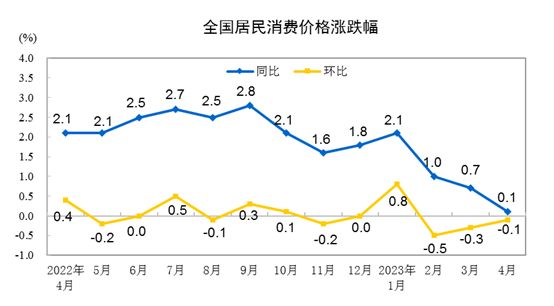 国家统计局5月11日发布的数据显示,2023年4月份,全国居民消费价格指数(CPI)同比上涨0.1%,环比下降0.1%。1-4月平均,CPI比上年同期上涨1.0%。