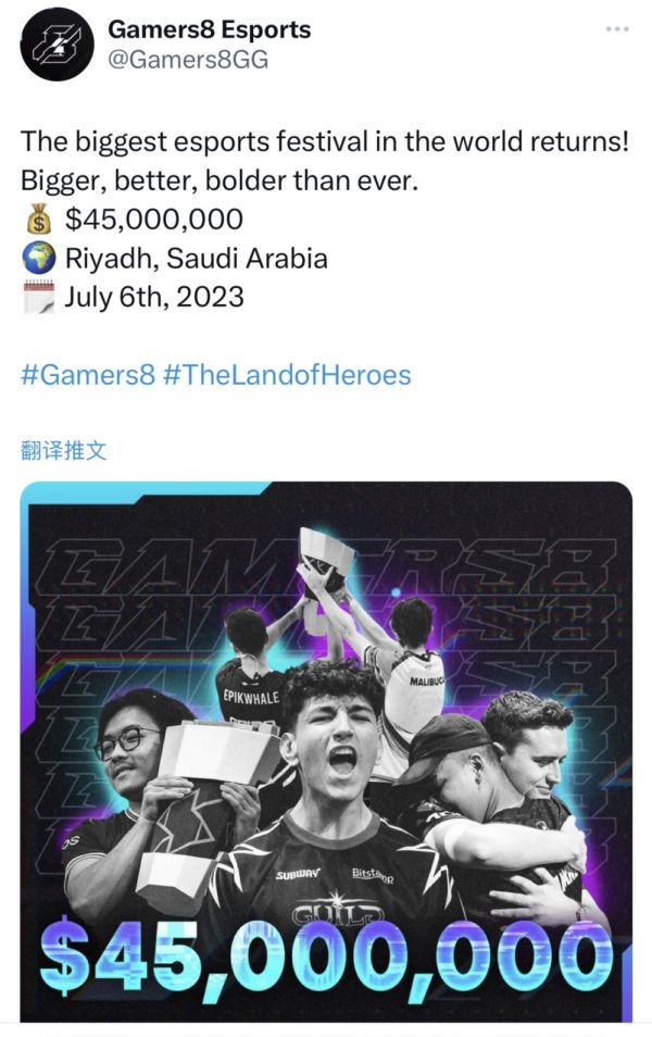 2023年3月8日,沙特电竞赛事公司Gamers8在官方Twitter上宣布,即将在今年7月6日于利雅得举行的Gamers8电竞赛事总奖金池达到了4500万美元(约合3.1亿人民币)——这个数字是上届Gamers8奖金的三倍,同时也打破了2021年举行的Dota2赛事 Ti10(4000万美元)的纪录,成为电子竞技历史上奖金最高的赛事。